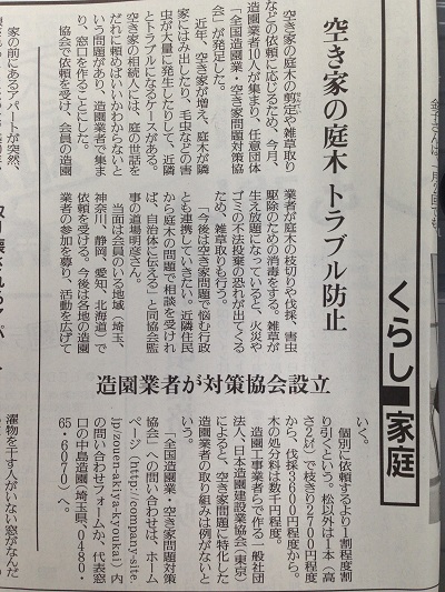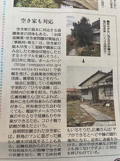 私は、「全国造園業・空き家問題対策協会」の会員として、空き家の庭問題の解決に取り組んでいます。 この取り組みは、マスコミからも注目され取材をされています。